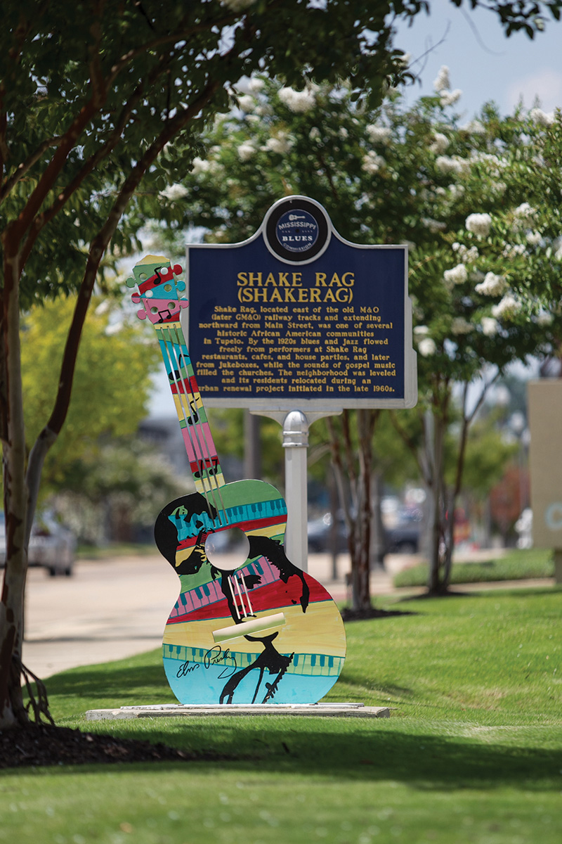 In downtown Tupelo, the Elvis Guitar Trail is a walking tour that takes visitors past more than 20 six-foot-tall sculptures of Elvis-themed guitars. On Main Street, attendees can stop in Tupelo Hardware Co., where Presley’s mother purchased his first guitar when he was 10 years old. A marked spot on the floor shows where Elvis stood when buying the guitar. There are also souvenirs, such as T-shirts and pins, documenting the sale.